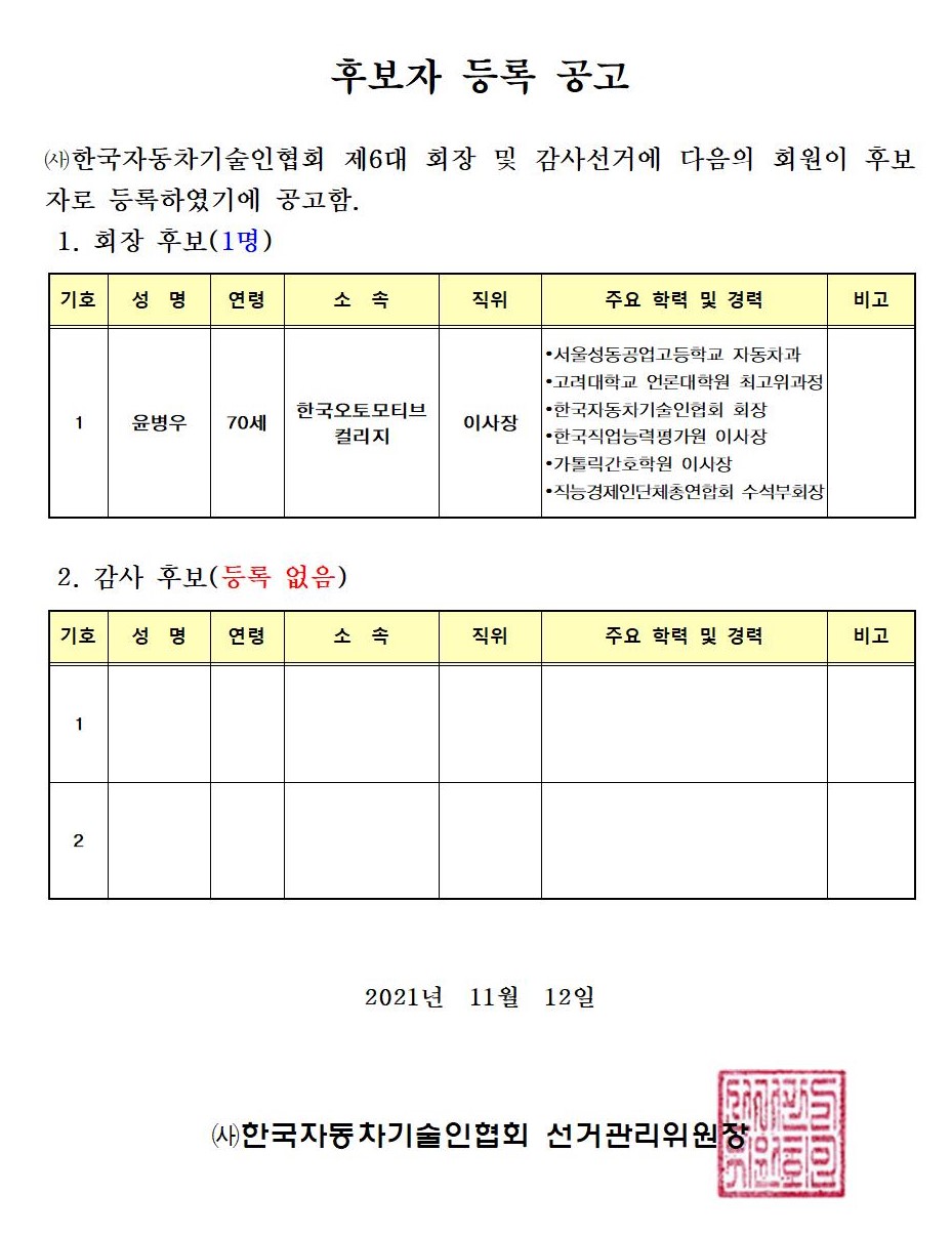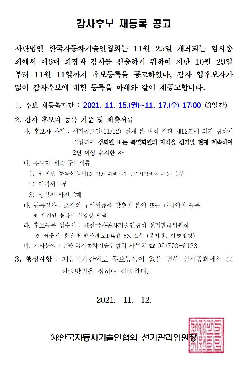 ¿À´Â 11¿ù 25ÀÏ(¸ñ) ¿ÀÈÄ 5½Ã¿¡ °³ÃֵǴ Çѱ¹ÀÚµ¿Â÷±â¼úÀÎÇùȸ 2021³âµµ ÀÓ½ÃÃÑȸ¿¡¼ ¼±ÃâÇÒ Á¦6´ë ȸÀå¼±°Å Èĺ¸ÀÚ·Î »ó±â ȸ¿øÀÌ µî·ÏÇÏ¿´À½°ú °¨»ç¼±°Å¸¦ À§ÇÑ È帵î·ÏÀÚ°¡ ¾øÀ½¿¡ µû¸¥ °¨»çÈĺ¸ Àçµî·Ï¸¦ °øÁöÇÏ¿À´Ï ÂüÁ¶ÇϽñ⠹ٶø´Ï´Ù