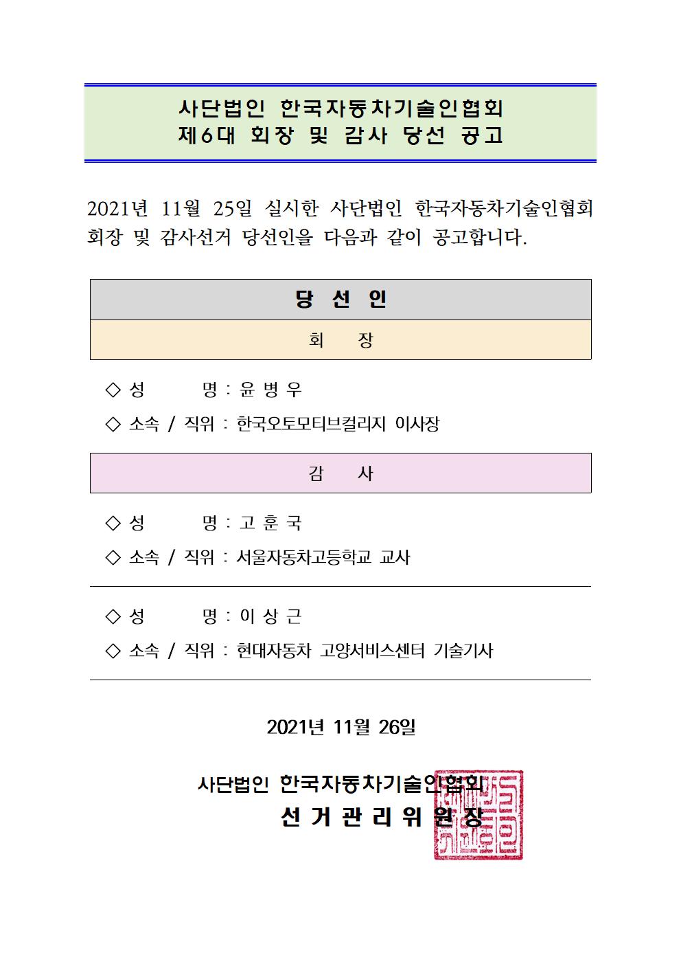 Çѱ¹ÀÚµ¿Â÷±â¼úÀÎÇùȸ´Â 12¿ù 6ÀÏ ÀÓ½ÃÃÑȸ¸¦ °³ÃÖÇÏ¿© Á¦5´ë ȸÀå°ú °¨»ç¸¦ ¼±ÃâÇÏ°í ±× °á°ú¸¦ °øÁöÇÕ´Ï´Ù.