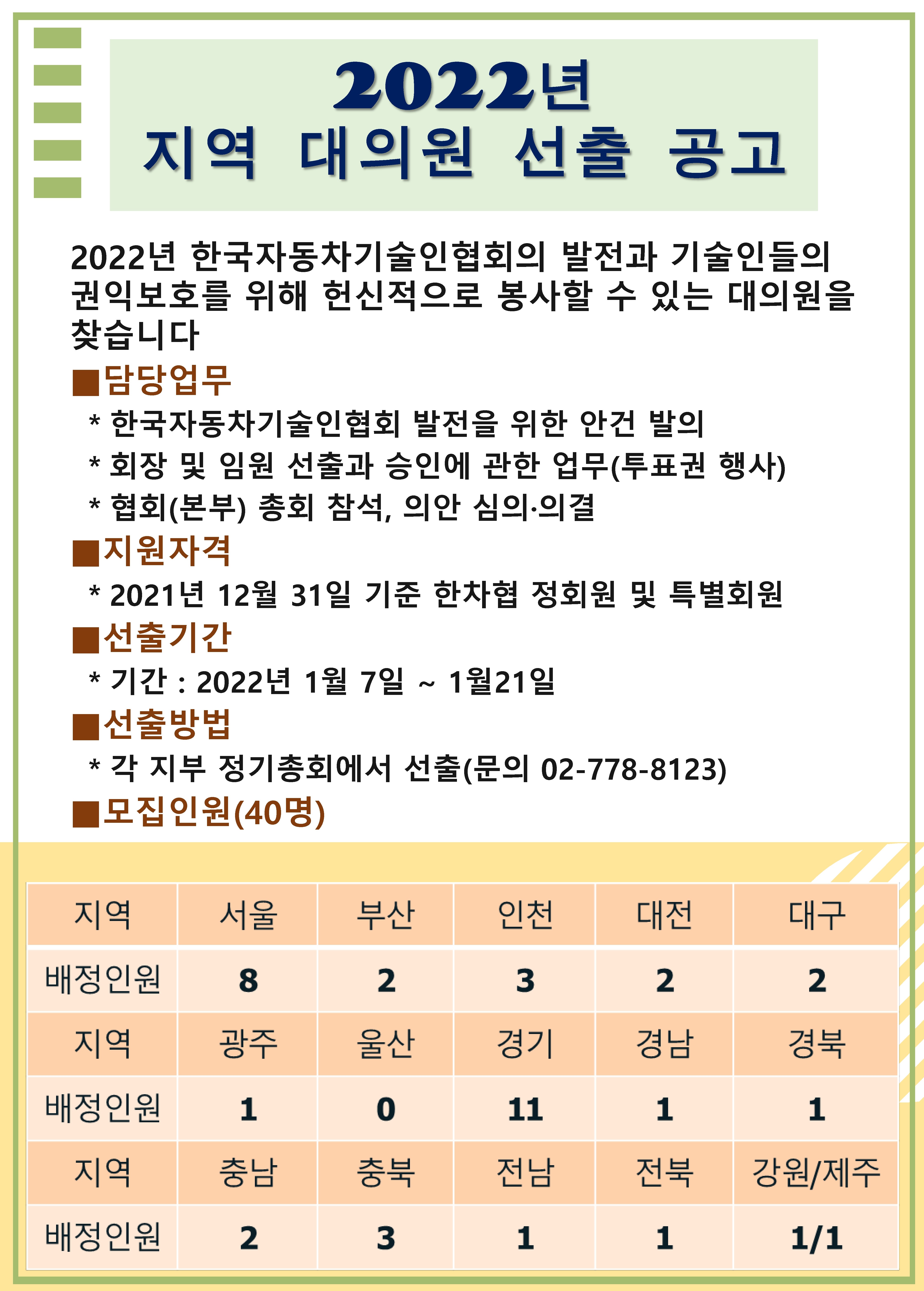 | Á¦¸ñ | 2022³â Çѱ¹ÀÚµ¿Â÷±â¼úÀÎÇùȸ ´ëÀÇ¿ø ¼±Ãâ°ø°í |