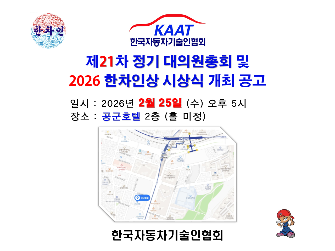 Çѱ¹ÀÚµ¿Â÷±â¼úÀÎÇùȸ Á¦21Â÷ Á¤±â´ëÀÇ¿øÃÑȸ ¹× 2026 ÇÑÂ÷Àλó ½Ã»ó½Ä °³ÃÖ(¾Ë¸²)