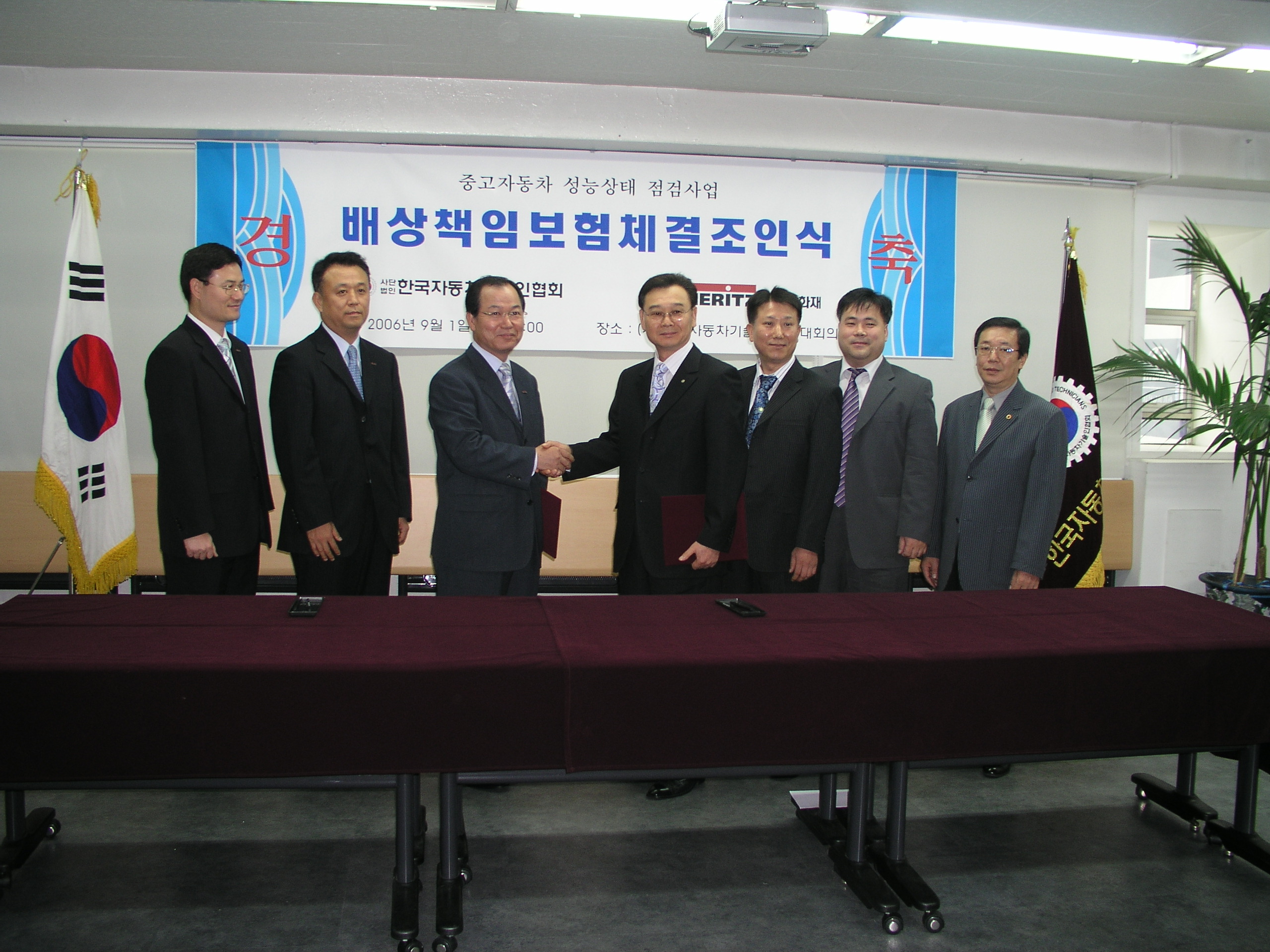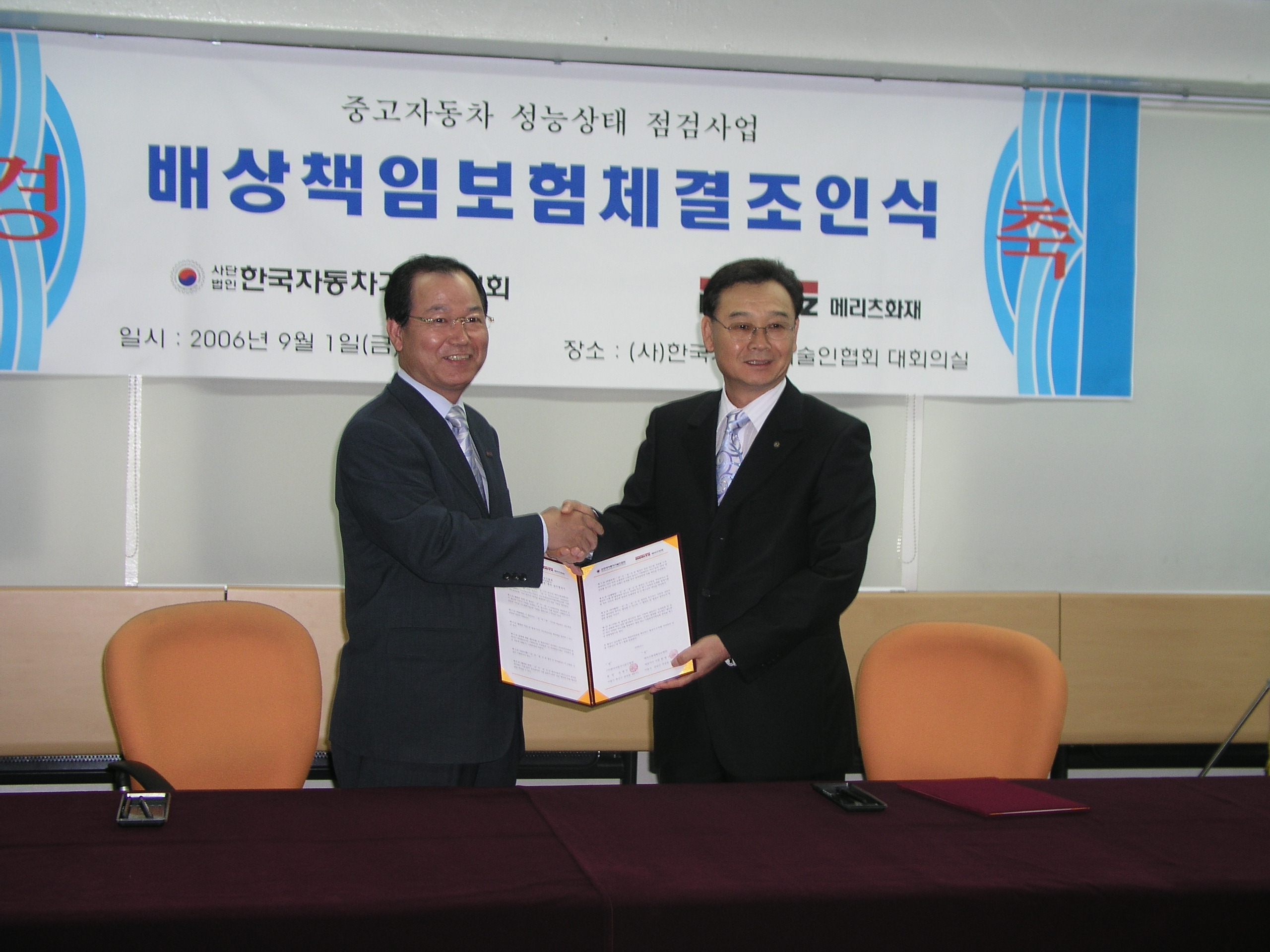 (»ç)ÇÑÂ÷Çù ȸÀå(À±º´¿ì)À» ºñ·ÔÇÑ ÀÓÁ÷¿øÀº 2006³â 9¿ù1ÀÏ ¿ÀÀü11½Ã Çùȸ ´ëȸÀǽǿ¡¼ ¸Þ¸®Ã÷ÈÀçÇØ»óº¸Çè(ÁÖ)ÀÇ Áö¿ëÇк»ºÎÀåÀ» ºñ·ÔÇÑ ÀÓÁ÷¿øµîÀÌ Âü¼®ÇÑ °¡¿îµ¥ Áß°íÀÚµ¿Â÷ ¼º´É»óÅÂÁ¡°Ë »ç¾÷ ¹è»óÃ¥ÀÓº¸Çè ü°áÁ¶ÀνÄÀ» °ÅÇàÇÏ¿´½À´Ï´Ù. À§ »çÁøÀº Çùȸ ȸÀå(À±º´¿ì-¿À¸¥ÂÊ)°ú ¸Þ¸®Ã÷ÈÀçÇØ»óº¸Çè(ÁÖ) Áö¿ëÇк»ºÎÀå(¿ÞÂÊ)ÀÌ ¾÷¹« ÇùÁ¤¼¸¦ ±³È¯ÇÏ´Â Àå¸éÀÔ´Ï´Ù.