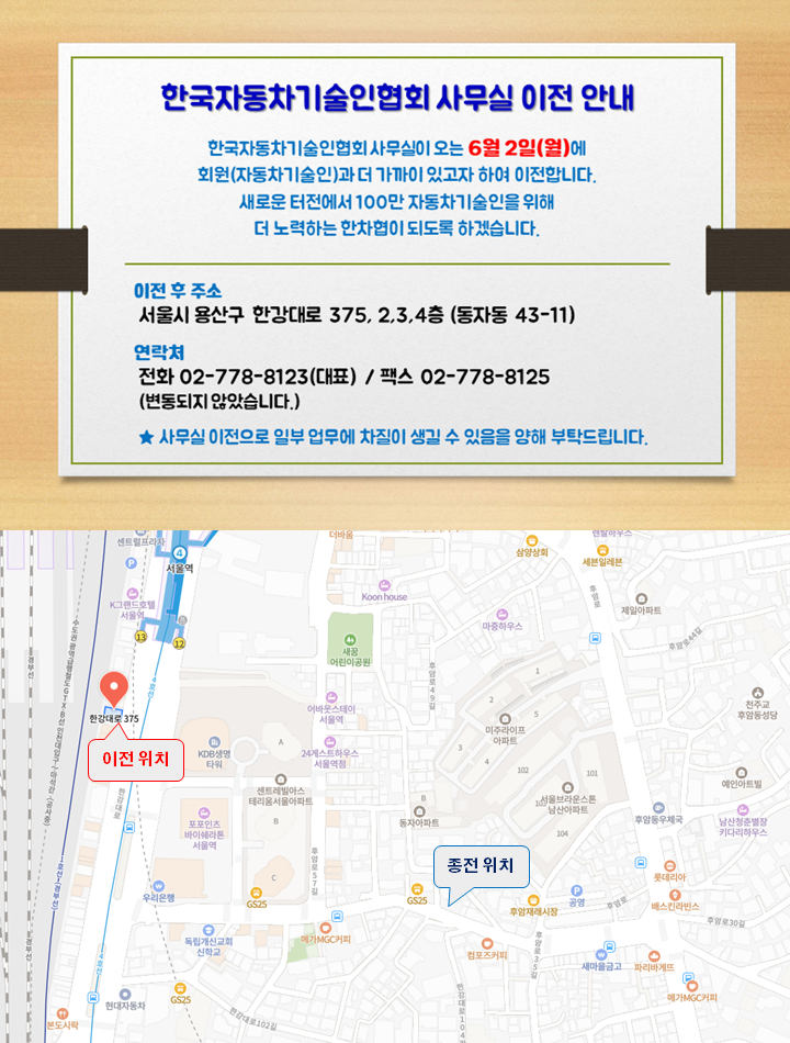 ![]() 1. ÀÌÀü »ç¹«¼Ò ÁÖ¼Ò : (04320) ¼¿ïƯº°½Ã ¿ë»ê±¸ ÇѰ´ë·Î 375, 2~4Ãþ (Á¾Àü Çѱ¹¿ÀÅä¸ðƼºêÄø®Áö-Çѱ¹ÀÚµ¿Â÷Á¤ºñÇпø- °Ç¹°) 2. ¿¬¶ôó : º¯µ¿¾øÀ½ |